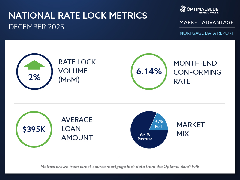 PLANO, Texas, Jan. 13, 2026 – Optimal Blue today released its December 2025 Market Advantage mortgage data report, showing that mortgage rate-lock activity ended the year on a firm footing, bucking typical holiday-driven seasonality. Total lock volume rose 2% month over month (MoM) from November and finished 30% higher year over year (YoY), driven primarily by rate-and-term refinances, which climbed 13% from November and more than 170% compared with December 2024. Cash-out refinance volume rose a modest 1% MoM but remained up a strong 35% YoY. Purchase activity dipped just 1% from November despite holiday headwinds to end December up 7% YoY.