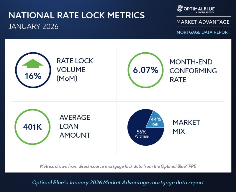PLANO, Texas, Feb. 10, 2026 – Optimal Blue today released its January 2026 Market Advantage mortgage data report, showing a strong start to the year as falling rates drove a sharp increase in refinance activity. Total rate-lock volume rose 16% month over month (MoM) and finished January 36% higher year over year (YoY), led by a surge in rate-and-term refinances, which climbed 50% from December and more than 400% compared with January 2025. Cash-out refinance activity also increased, rising 11% MoM and 38% YoY. Purchase volume grew a modest 3% from December but remained down 5% from a year earlier, reflecting the slower response of purchase demand to changing rate conditions early in the year.